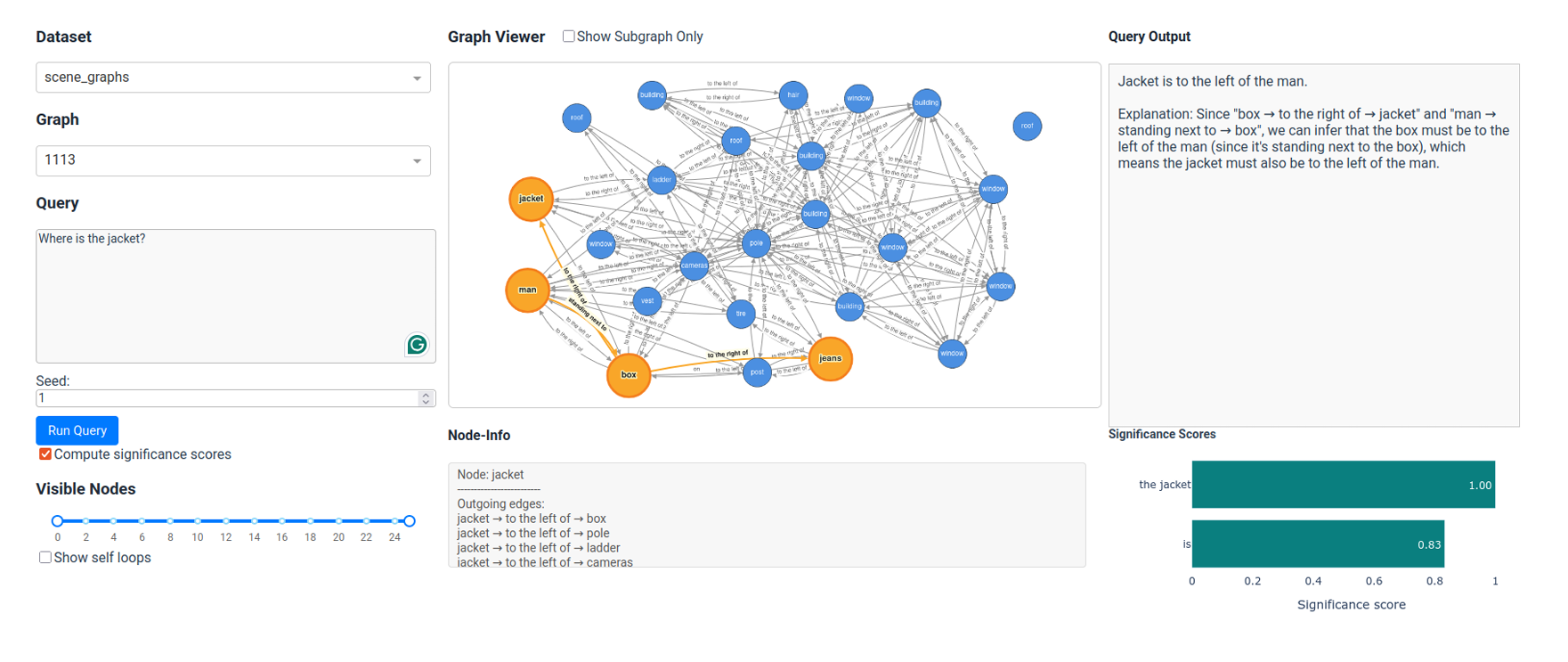 Interactive graph visualization system to query graphs using natural language, providing LLM explanations and significance scores for query terms.